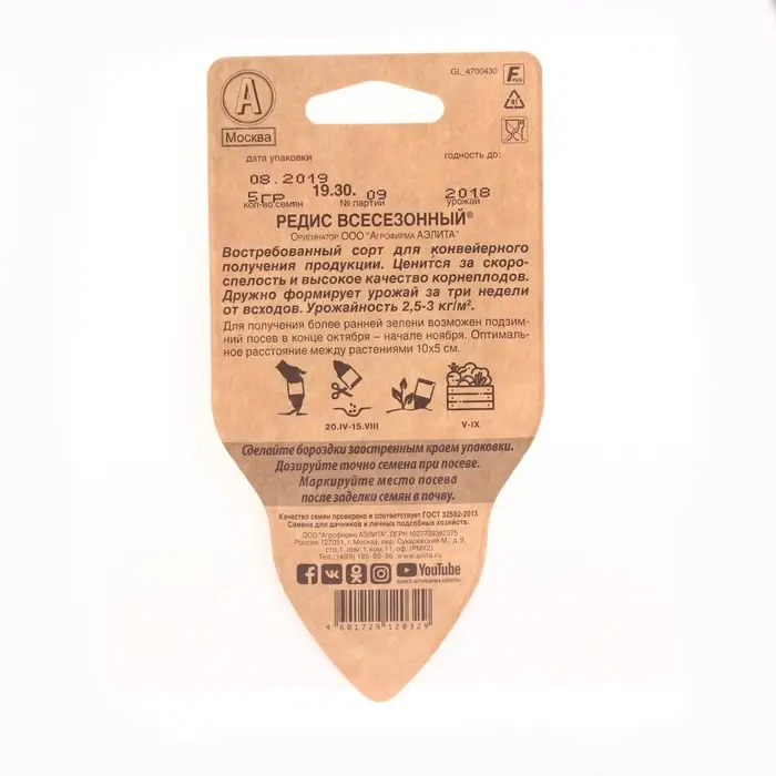 Раннеспелый, высокоурожайный сорт редиса. Предназначен для выращивания от весны до осени в открытом грунте, а в ранневесенний и позднеосенний периоды– в защищенном грунте. Корнеплоды округлые, ярко-красного цвета, массой около20 г, с нежной, сочной, вкусной витаминной мякотью. Сорт устойчив к цветушности.