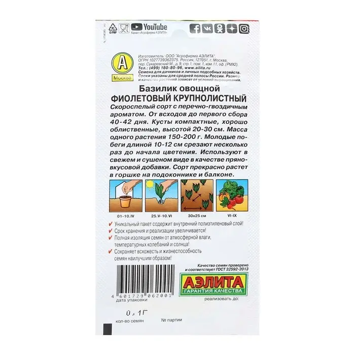 Семена Базилик овощной "Фиолетовый крупнолистный", 0,1 г