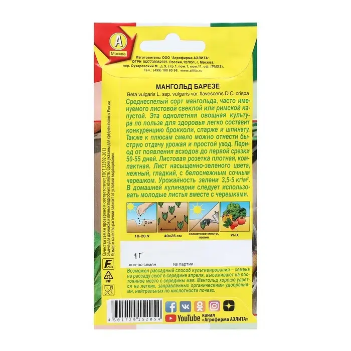 Среднеспелый сорт мангольда, часто именуемого листовой свеклой или римской капустой. Эта однолетняя овощная культура по пользе для здоровья легко составит конкуренцию брокколи, спарже и шпинату. Также к плюсам смело можно отнести бы струю отдачу урожая и простой уход. Период от появления всходов до первой срезки 50-55 дней. Листовая розетка плотная, компактная. Лист насыщенно-зеленого цвета, нежный, гладкий, с белоснежным сочным черешком. Урожайность зелени 3,5-5 кг/м2. В домашней кулинарии следует использовать молодые листья вместе с черешками.