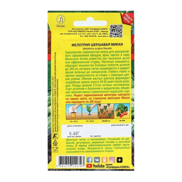 Однолетняя, травянистая лиана для декоративного оформления беседок, арок, пергол в саду. Мелотрия более известна как мышиная дыня или африканский огурец. Растения вьющиеся, образуют множество боковых побегов длиной до 300 см, которые легко укореняются и радуют яркой зеленью до заморозков. Побеги ловко и прочно закрепляются за опоры с помощью цепких усиков. Обилие желтых цветков формирует съедобные завязи спустя 55-60 дней после всходов. Плоды длиной 2-3 см, сочные, кисловатые. Сорт устойчив к болезням и вредителям, объемная зеленая масса стремительно подавляет сорняки.