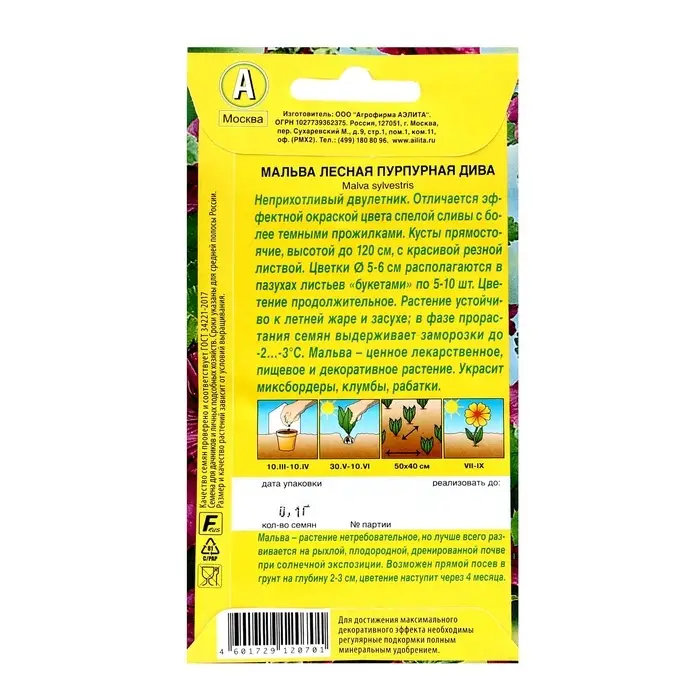 Семена цветов Мальва "Пурпурная дива", ц/п, 0,1 г