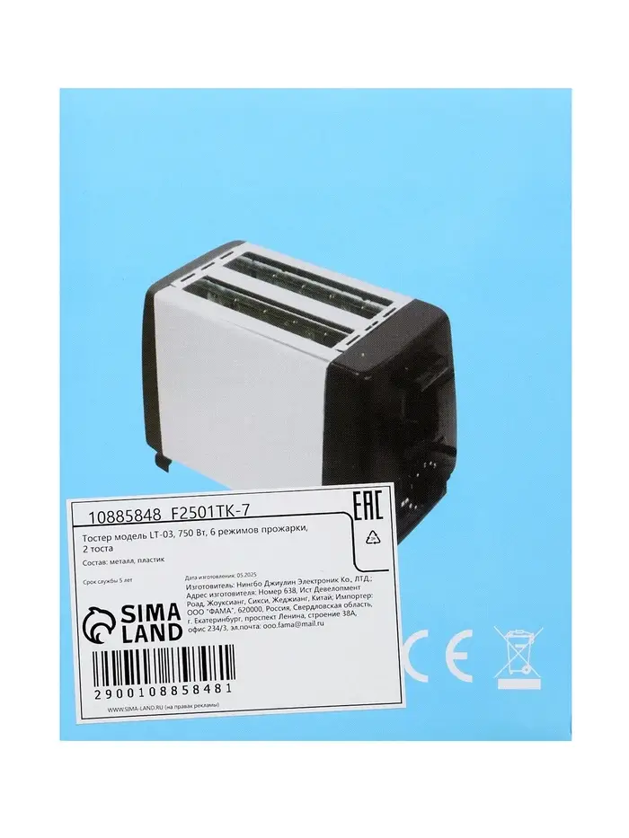 Тостер LT-03, 750 Вт, 6 режимов прожарки, 2 тоста, серебристый