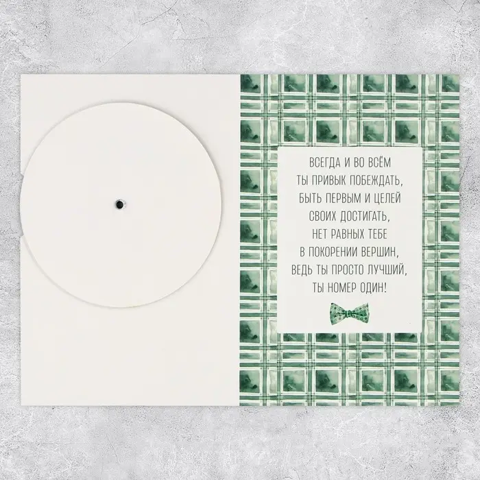 Открытка с вращающимся элементом в виде колеса. При приведении колеса в движение, в вырубном окне открытки сменяются изображения