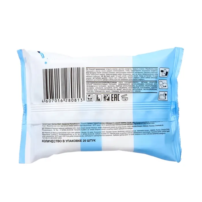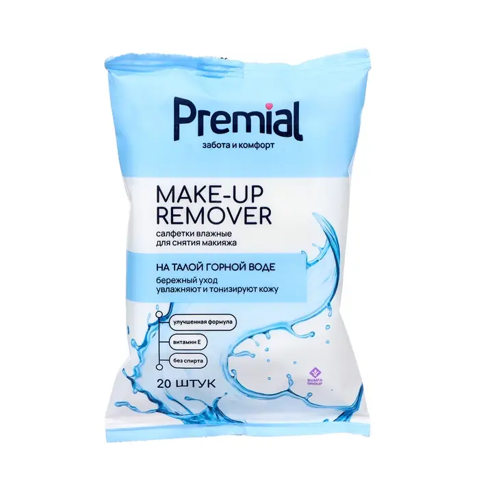 Влажные салфетки Premial, для снятия макияжа, 20 шт.