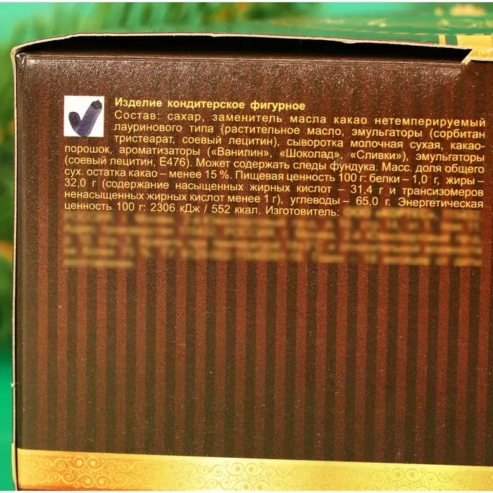 Состав: Сахар, заменитель масла какао нетемперируемый лауринового типа (растительное масло, эмульгаторы (сорбитан тристеарат, соевый лецитин), сыворотка молочная сухая, какао-порошок, ароматизаторы («Ванилин», «Шоколад», «Сливки»), эмульгаторы (соевый лецитин, Е476). Может содержать следы фундука.