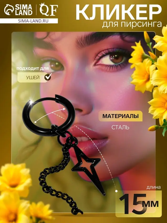 Пирсинг в ухо «Кольцо» звезда полярная с цепью, d=15 мм, чёрный
