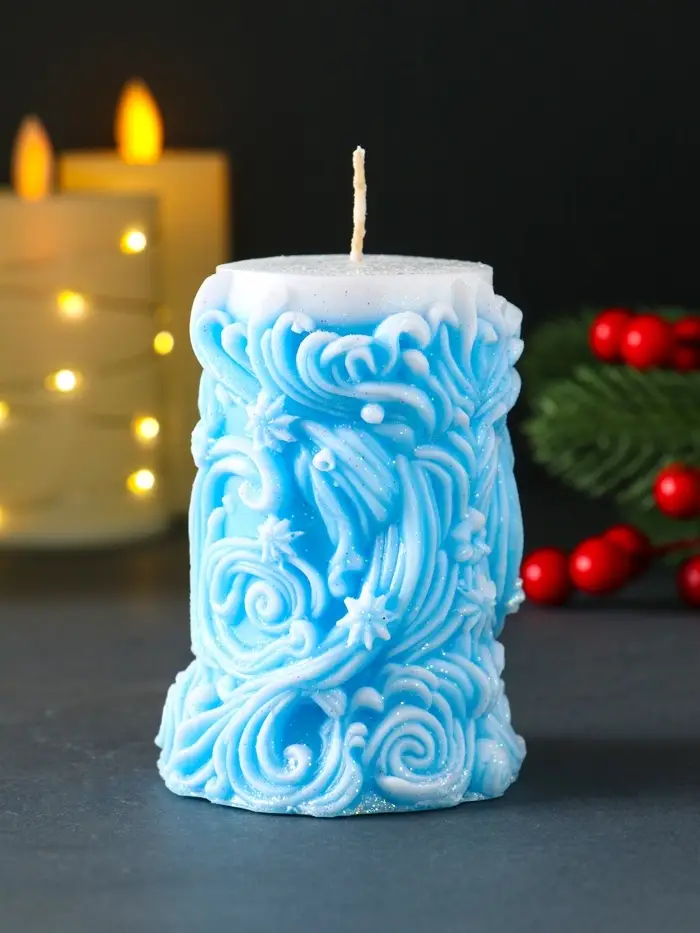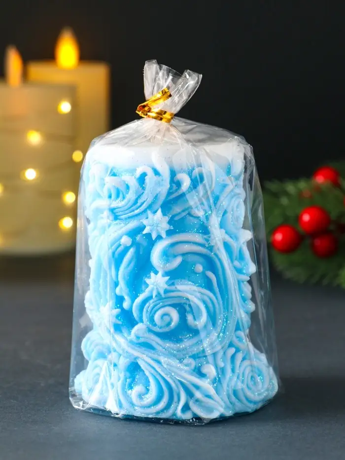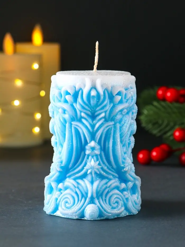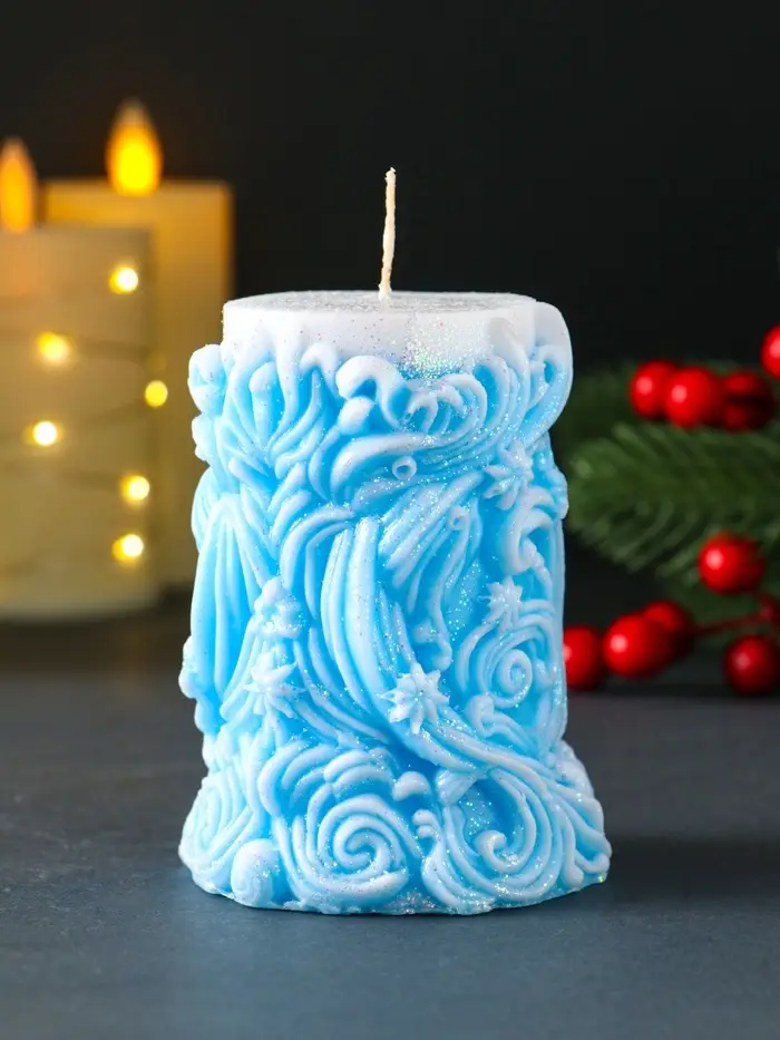 Свеча новогодняя столбик "Резная" голубой