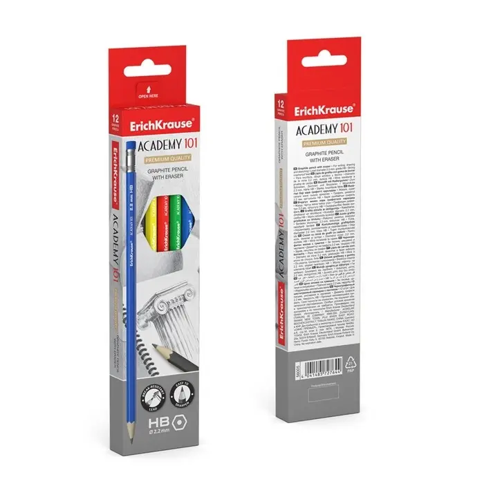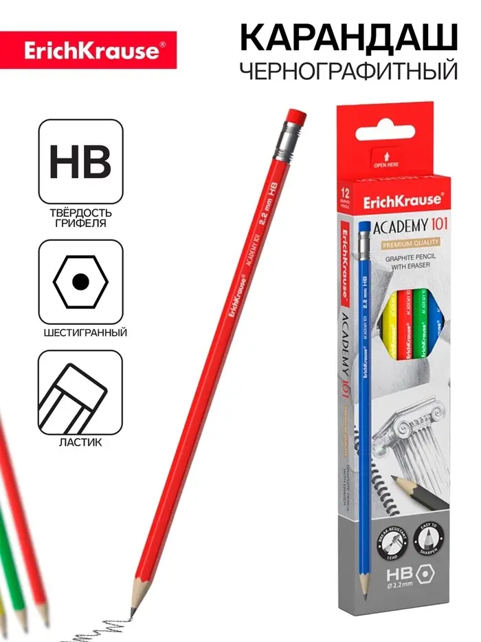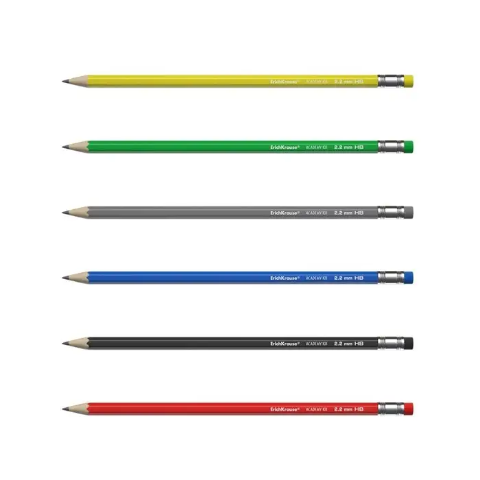 Карандаш чернографитный с ластиком ErichKrause Academy, НВ, грифель d=2,2 мм, дерево, шестигранный в коробке, микс