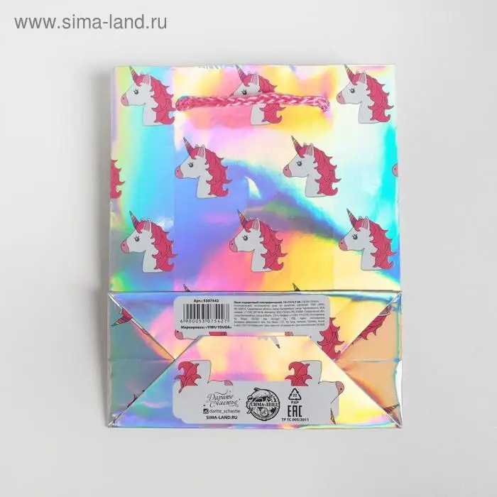 Пакет подарочный голографический, упаковка, «Единорожки», 12 х 15 х 5.5 см