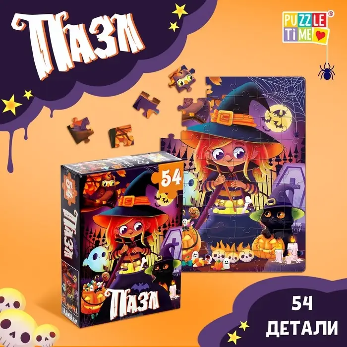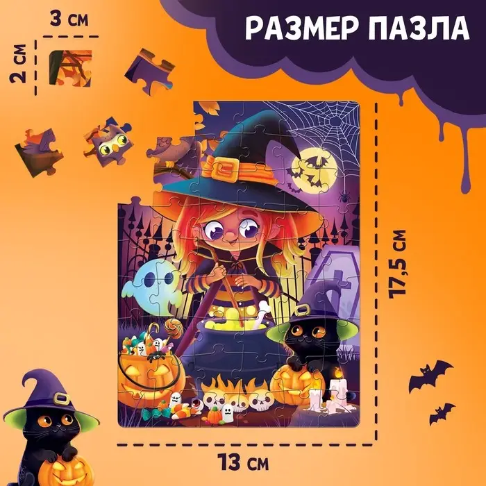 Пазл «Ведьмочка» с хэллоуинским сюжетом — то, что нужно для полезного и увлекательного досуга в канун Дня Всех Святых! Такой презент станет приятным дополнением к основному подарку и заинтересует ребёнка необычным сюжетом.