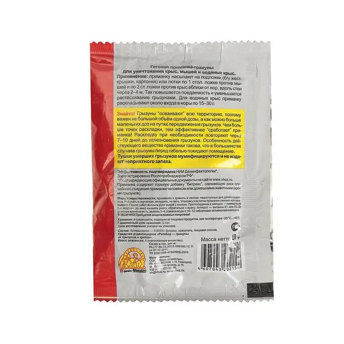 Меры предосторожности: применять и хранить в местах, недоступных для детей и животных. Работать в перчатках, не курить, не пить. Упаковку и остатки приманки сжигают или закапывают.