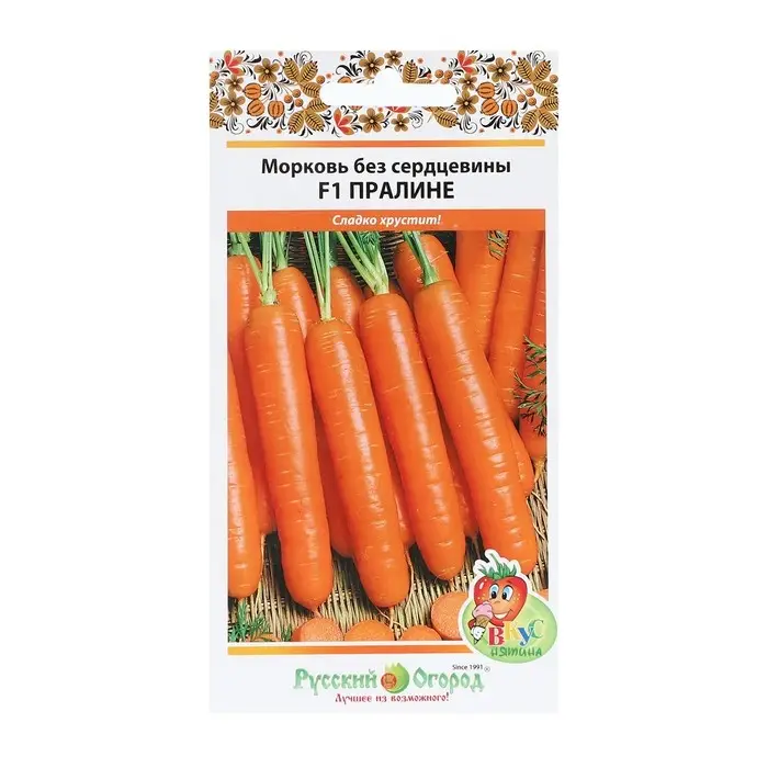 Сорт моркови, плоды которого ровные, крупные и очень сочные. Это морковь без сердцевины, поэтому на вкус очень хрустящая и однородная. У моркови сорта «Пралине» особенная урожайность – все корнеплоды почти одинаковых размеров и правильной цилиндрической формы. Средняя длина одной морковки данного сорта – 22 см.