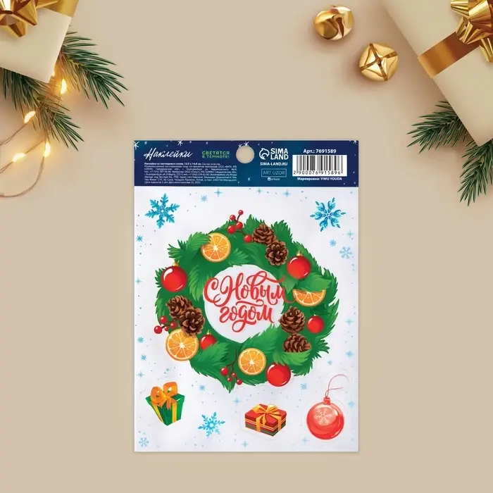 Наклейки новогодние со светящимся слоем «Новогодний венок», 10.5 х 14.8 см