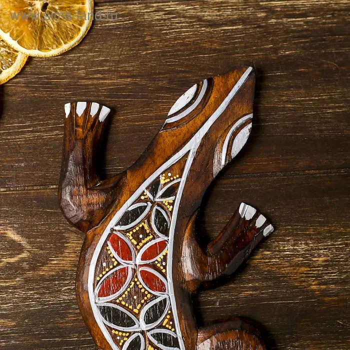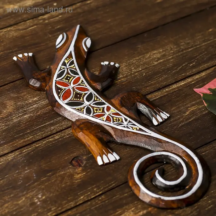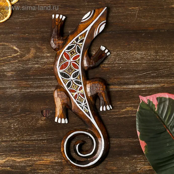 Не каждый осмелится разместить такое панно ручной работы в своем интерьере. Ведь порой кажется, что это настоящая живая рептилия. Искусные индонезийские мастера изобразили всё настолько детализировано четко, что хочется прикоснуться к панно «Геккон», 31×11×1 см, дерево и ощутить тонкие линии изгибов этой «ящерицы счастья».