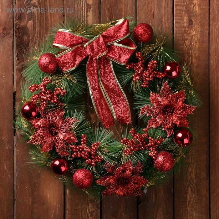 Венок новогодний d-36 см "Бантик" красные ягодки и цветы