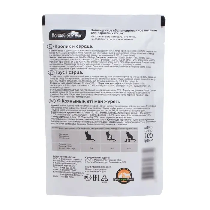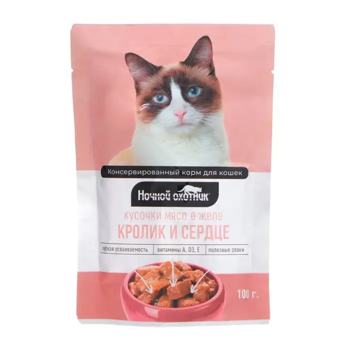 Влажный корм "Ночной охотник" для кошек, кролик/сердце в желе, пауч, 100 г