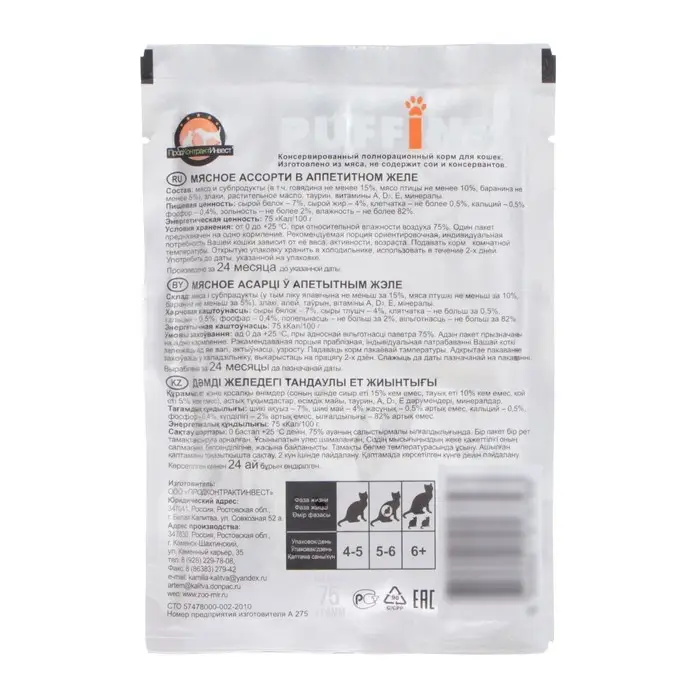 Пакет дой-пак для кошек «Puffins» — идеальный выбор для вашего пушистого друга! Этот влажный корм эконом класса представлен в удобной упаковке 75 гр и порадует вашего питомца вкусом нежных мясных кусочков в соусе или в желе.