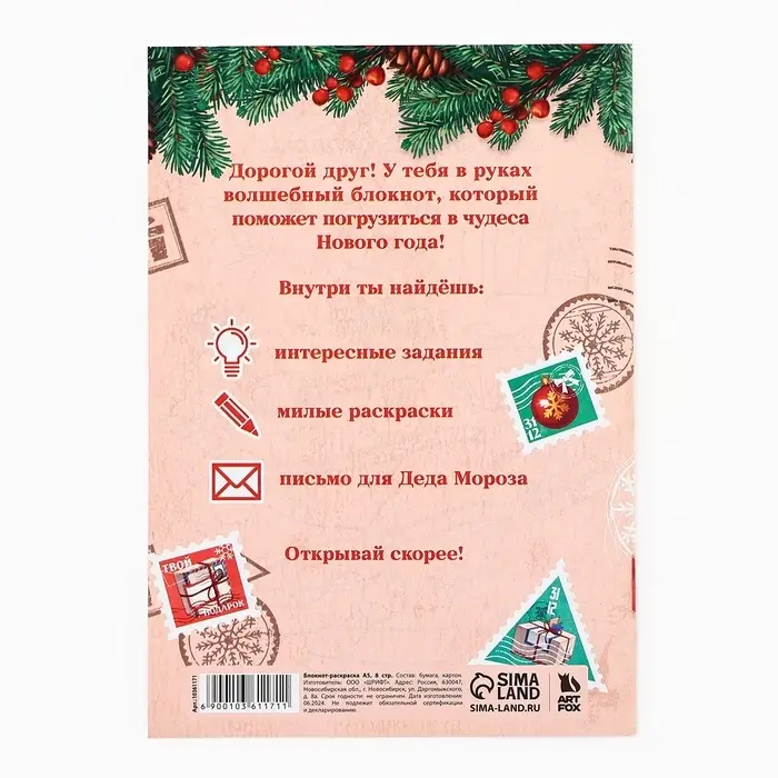 Блокнот детский с раскраской, А5, 8 страниц «Новогодняя почта с Дедом Морозом»