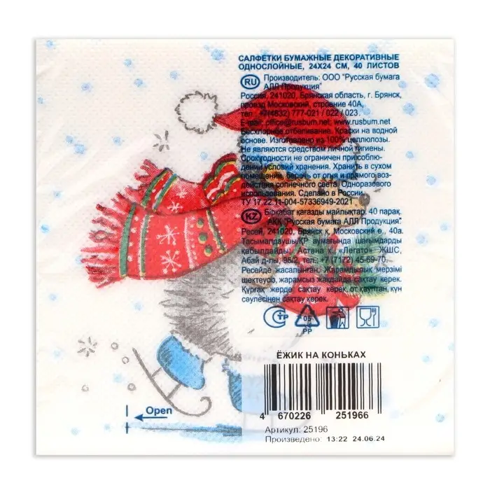 Салфетки новогодние бумажные Desna Design «Ёжик на коньках», 1 слой, 24х24 см, 40 шт.