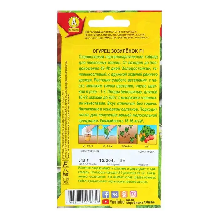 Семена огурцов «Зозуленок F1» — скороспелый (период от всходов до плодоношения составляет 43‒48 дней), холодостойкий, партенокарпический гибрид салатного назначения.