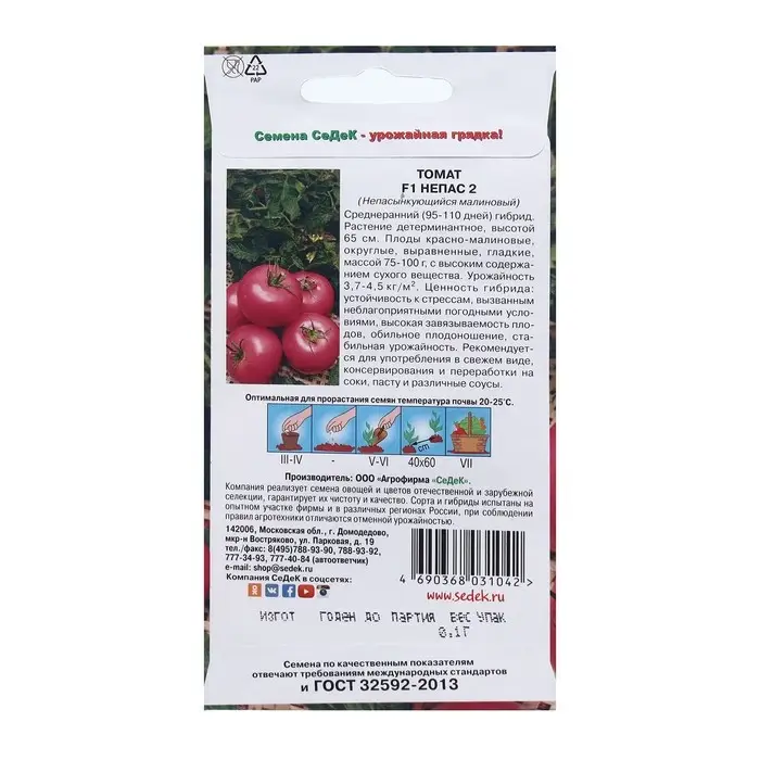 Среднеранний (95-110 дней) сорт. Растение детерминантное, высотой 65 см. Плоды красно-малиновые, округлые, выравненные, гладкие, массой 75-100 г, с высоким содержанием сухого вещества. Урожайность 3,7-4,5 кг/м2. Ценность сорта: устойчивость к стрессам, вызванным неблагоприятными погодными условиями, высокая завязываемость плодов, обильное плодоношение, стабильная урожайность. Рекомендуется для употребления в свежем виде, консервирования и переработки на соки, пасту и различные соусы.