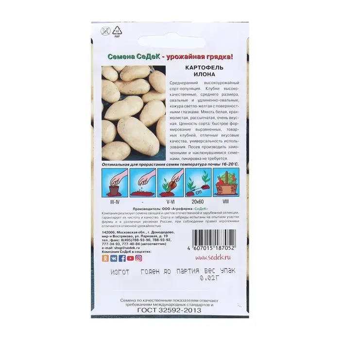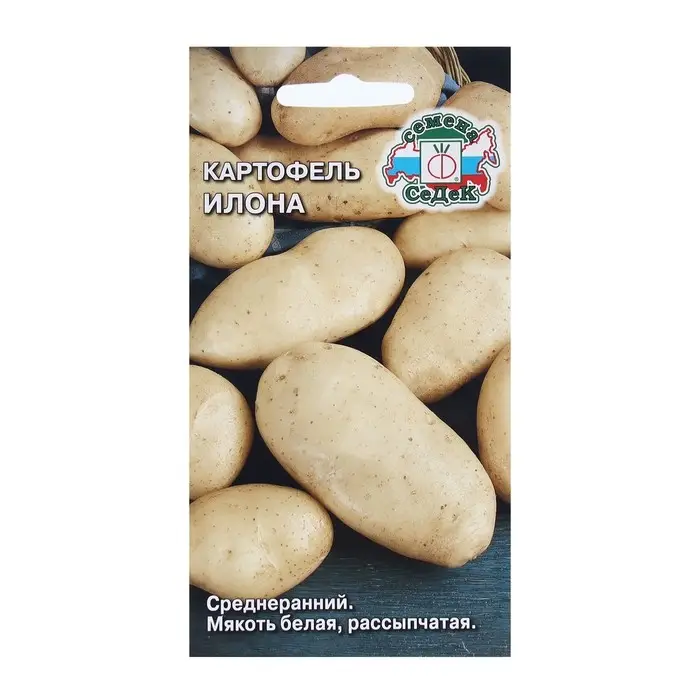 Семенной картофель "Илона" - среднеранний сорт столового назначения. Куст крепкий, слегка раскидистый. Клубни крупноплодные, продолговатой формы. Кожура гладкая, светлого цвета, глазки небольшие, поверхностные. Мякоть белого цвета, при варке рассыпчатая, с отличным вкусом. Сорт картофеля "Илона" отличается хорошей устойчивостью к вирусным болезням, хорошо переносит любые климатические изменения. Ценность сорта: высокая и стабильная урожайность. Пригоден для длительного хранения.