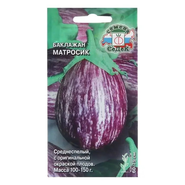 Среднеспелый (111-115 дней) сорт для открытого грунта и пленочных укрытий. Растение полураскидистое, высотой 60-75 см. Плоды крупные, овально-грушевидные, сиреневые с белыми полосами, массой 100-150 г и более. Мякоть белая, без горечи. Ценность сорта: выносливость к вертициллезному увяданию, высокая урожайность, оригинальная окраска, отличные вкусовые и технологические качества плодов. Рекомендуется для консервирования кусочками, засолки, кулинарной переработки.