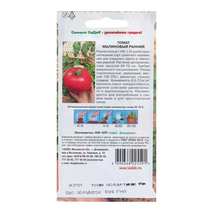 Раннеспелый (105-110 дней) крупноплодный сорт салатного назначения для открытого грунта и пленочных укрытий. Растение детерминантное, высотой 60-70 см. Требует умеренного пасынкования. Плоды плоскоокруглые, малиновые, массой 150-250 г, мясистые, сочные, сладкие. Урожайность 6,5-7,5 кг/м2. Ценность сорта: холодостойкость, удачное сочетание раннеспелости и крупноплодности. Рекомендуется для употребления в свежем виде и для приготовления соков.
