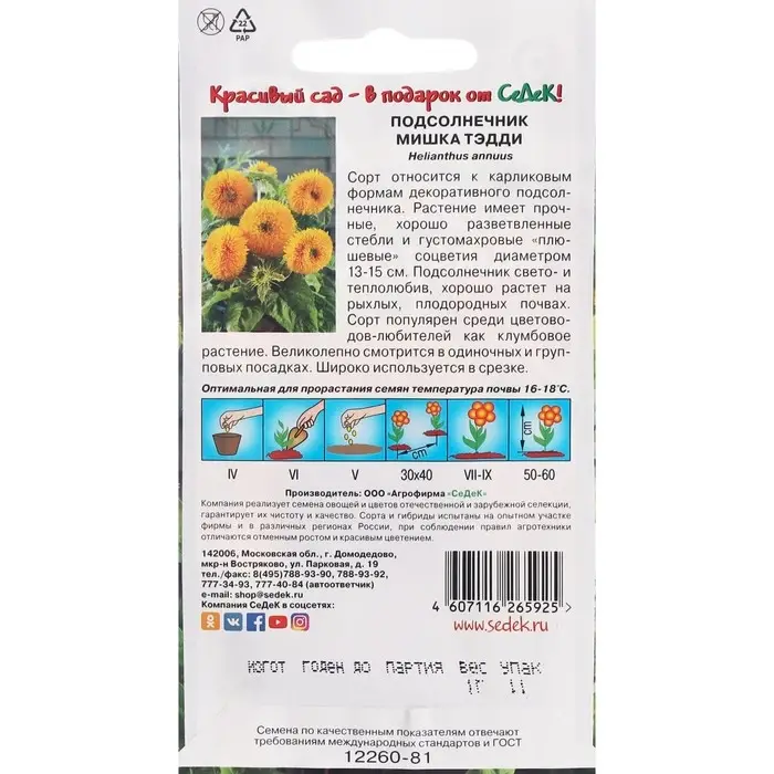 Семена цветов Подсолнечник "Мишка Тэдди "F1 1 г