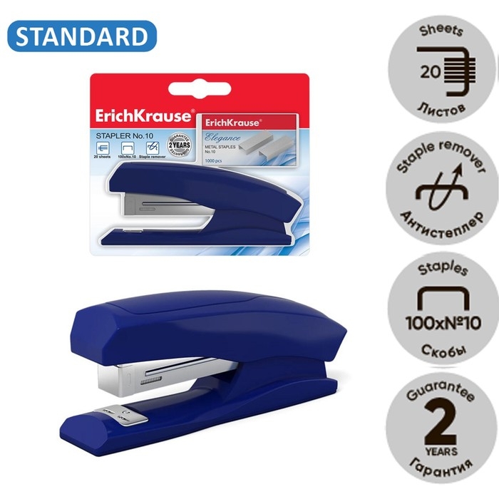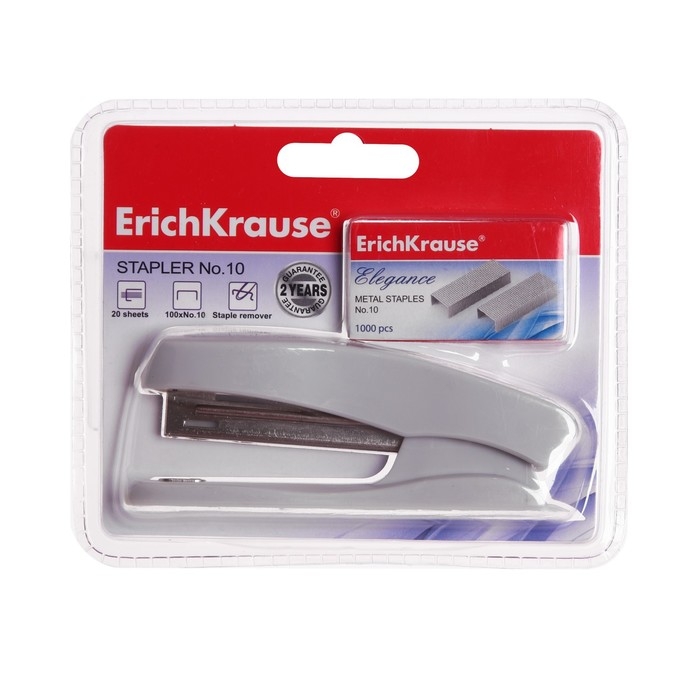 Степлер Erich Krause Elegance + скобы, № 10, до 20 листов, в блистере, встроенный антистеплер, синий, МИКС