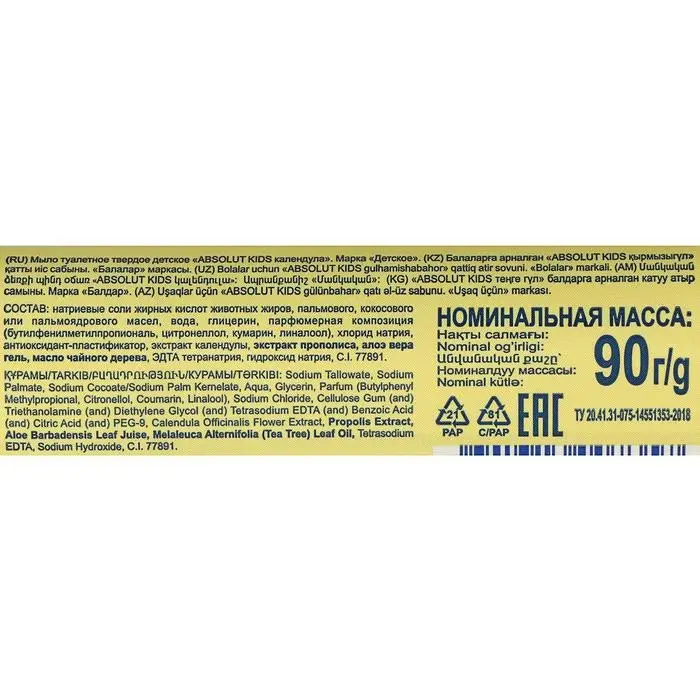 Мыло детское Absolut Kids «Календула», антибактериальное, 90 г обладает противовоспалительным и смягчающим действием, сохраняет кожу нежной и здоровой.