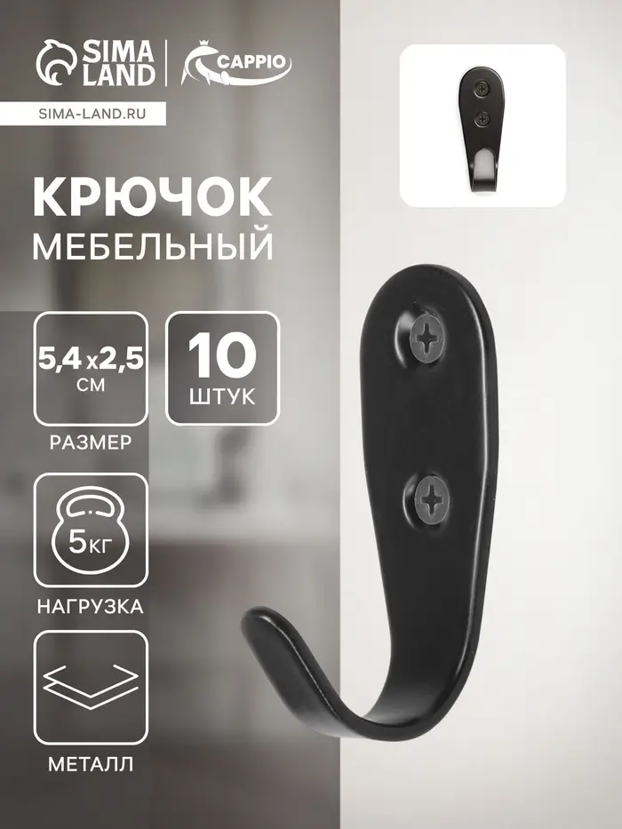 Крючок мебельный ТУНДРА TKO017, однорожковый, черный, 10 шт.