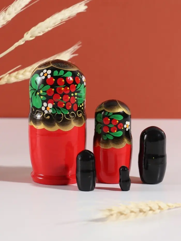 Высота главной куклы — 11-12 см — делает её идеальным размером для демонстрации на полке или в качестве подарка. Роспись в стиле хохлома, выполненная вручную, превращает этот набор в уникальное изделие, которое украсит любой интерьер и станет символом русского наследия.