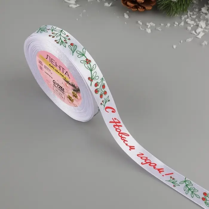Лента атласная «С Новым годом!», 15 мм, 23 ± 1 м, цвет белый №01