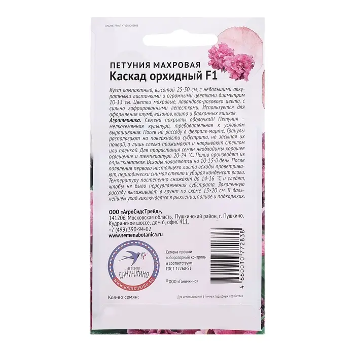 Куст компактный, высотой 25-30 см, с небольшими аккуратными листочками и огромными цветками диаметром 10-13 см. Цветки махровые, синего цвета, с сильно гофрированными лепестками. Используется для оформления клумб, вазонов, кашпо и балконных ящиков. Агротехника: Семена покрыты оболочкой! Петуния – мелкосемянная культура, требовательная к условиям выращивания. Посев на рассаду в феврале-марте. Гранулы располагают на поверхности субстрата, не засыпая их почвой, а лишь слегка прижимают и накрывают стеклом или пленкой. Для прорастания семян необходимо хорошее освещение и температура 20-24˚С. Полив производят из опрыскивателя. Всходы появляются на 10-15 день. После появления первого настоящего листа всходы проветривают, периодически снимая стекло и убирая конденсат влаги. Температуру постепенно снижают до 14-16˚С и следят, чтобы не было переувлажнения субстрата. Закаленную рассаду высаживают в грунт по схеме 15×20 см. В дальнейшем уход заключается в рыхлении, поливе и подкормах. Штрих-код - 4660010772784