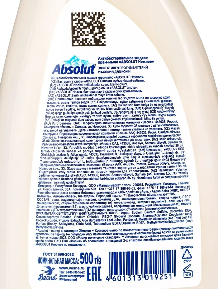 Антибактериальное жидкое мыло ''ABSOLUT 2в1" нежное, 500 г