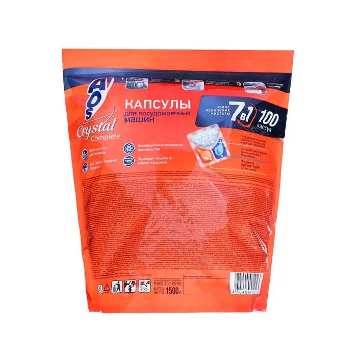 Капсулы для посудомоечных машин AOS «Crystal Complete» обеспечивают идеальную чистоту вашей посуды. Благодаря специальной формуле они эффективно удаляют даже самые стойкие загрязнения, такие как пригоревший жир и остатки пищи.