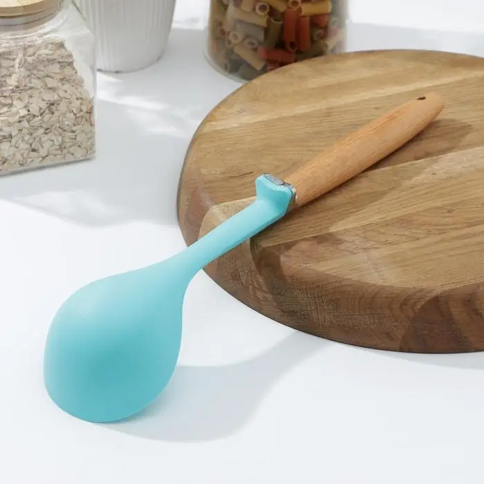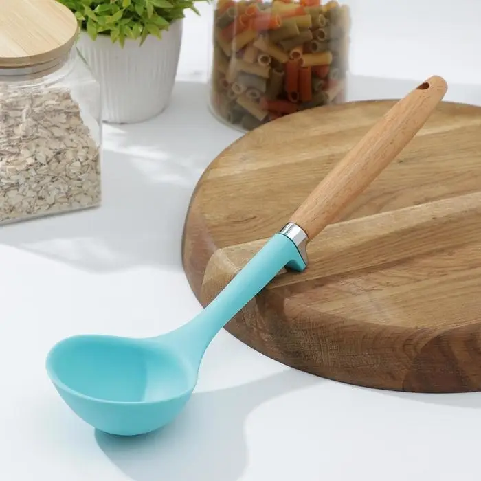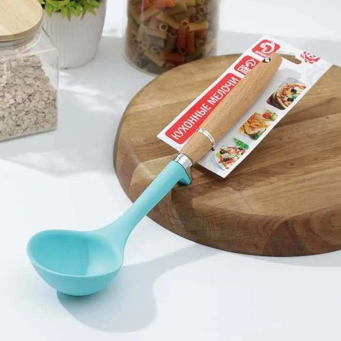 - Выполнен из экологичных материалов. Рукоятка разливной ложки выполнена из натурального дерева. Рабочая часть предмета - из термостойкого пищевого пластика.