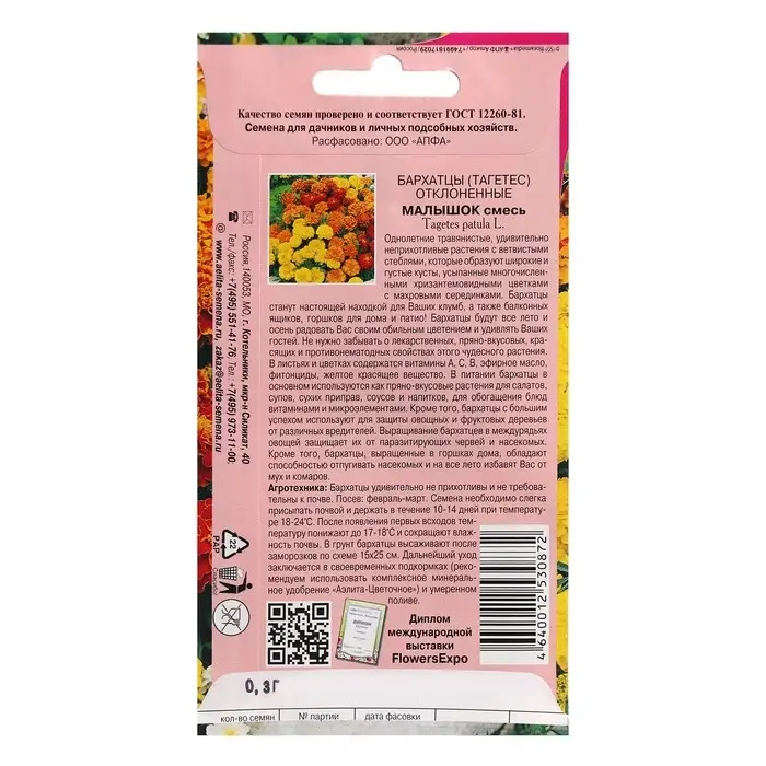 Семена цветов Бархатцы отклоненные "Малышок", смесь, 0,3 г