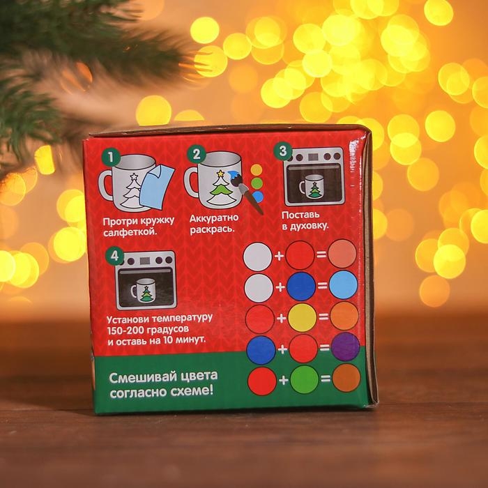 На кружке нанесены контуры будущего изображения, которые крохе предстоит заполнить акриловыми красками. После высыхания они хорошо держатся на керамической поверхности, так что изделие можно будет мочить и даже разогревать в микроволновой печи.