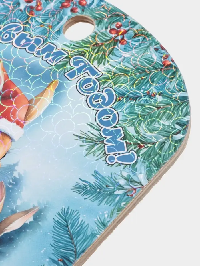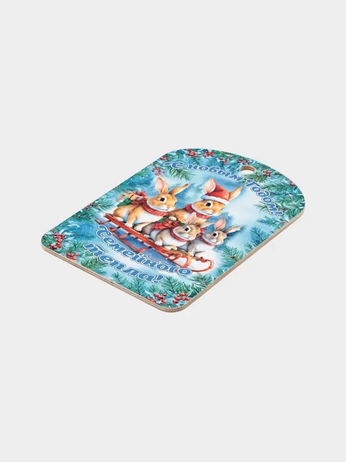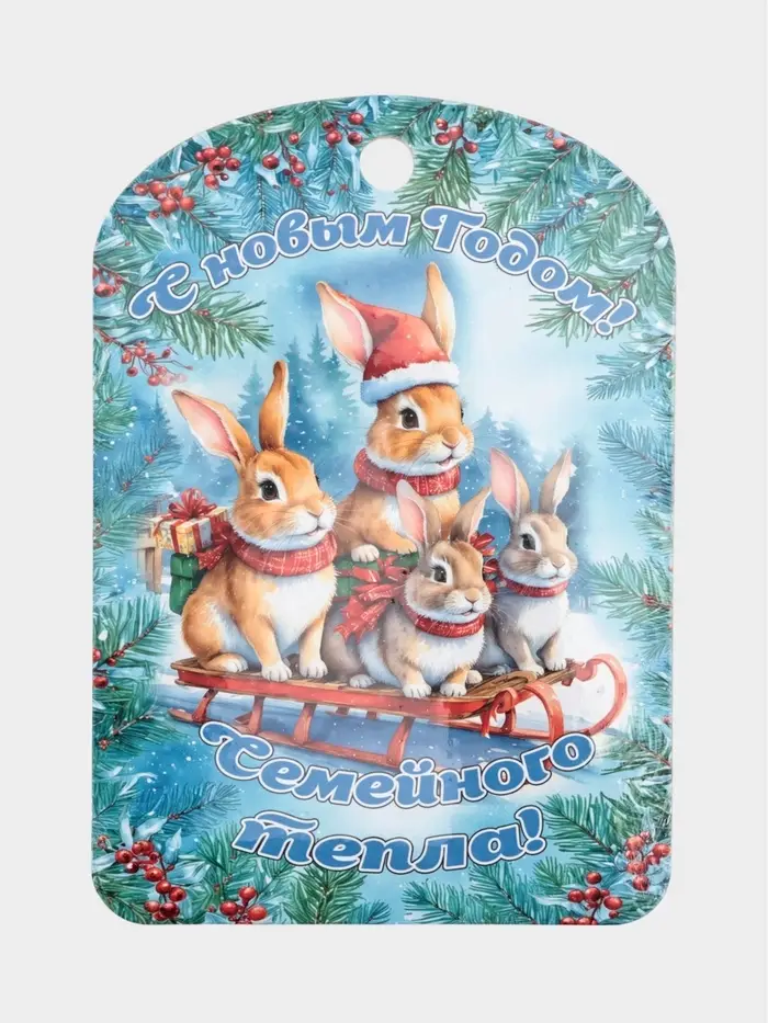 Разделочная доска «С Новым годом! Кролики» — это лёгкий, добрый акцент праздничного настроения на кухне. На ней изображены новогодние кролики в уютной зимней сценке: они будто только что пришли с прогулки по заснеженному саду, неся с собой тепло и спокойствие. Доска подойдёт для нарезки сыра, фруктов или овощей к праздничному столу, а после — легко превратится в украшение: её можно повесить на стену или дверцу шкафчика, чтобы сохранить атмосферу праздника.