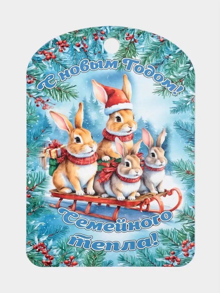 Такая доска — тёплый и осмысленный сувенир для тех, кто встречает праздник в кругу семьи. Кролики на деревянном фоне символизируют уют, заботу и тихую радость зимы. Подарите её близкому человеку — и пусть каждый взгляд на кухню напоминает: самое ценное в Новом году — это те, кто рядом.