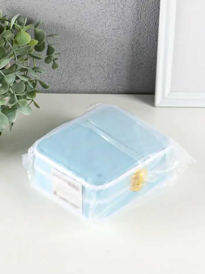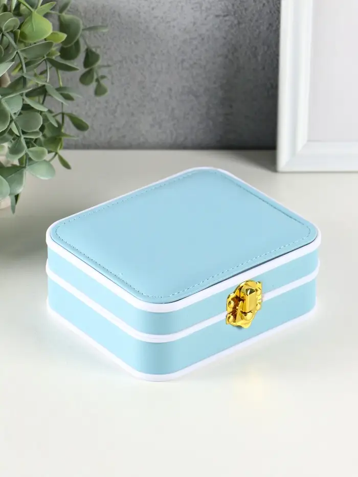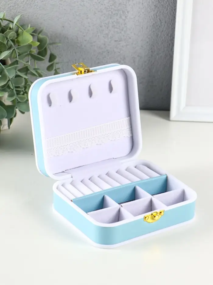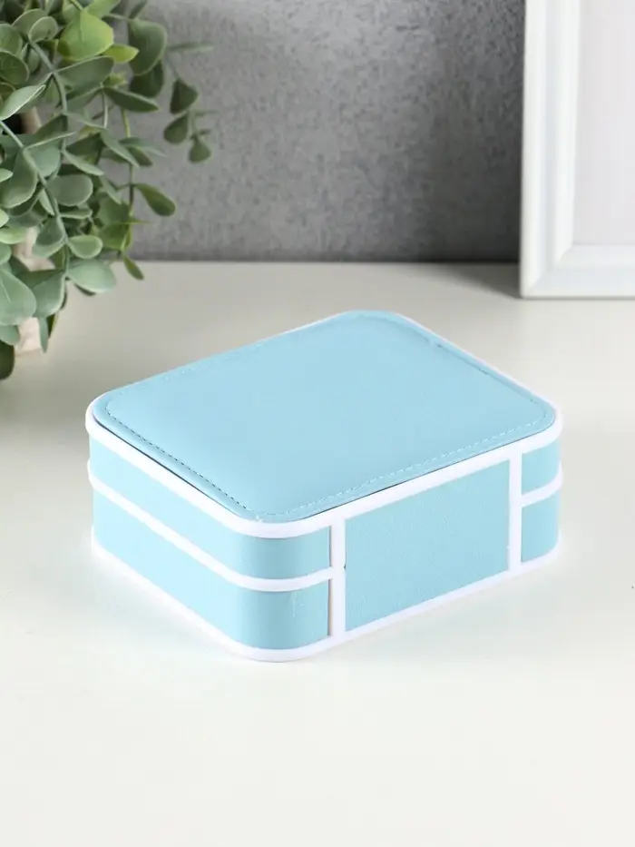 Шкатулка пластик, кожзам для украшений 6 ячеек, 10 полос, голубая 13,5х11,5х5,5 см