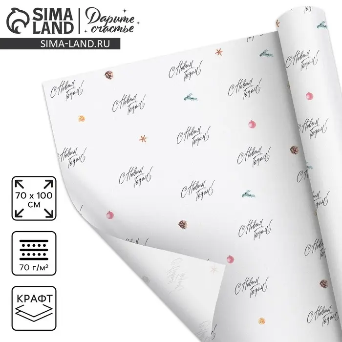 Упаковочная бумага на новый год крафтовая «С новым годом!», 70 х 100 см