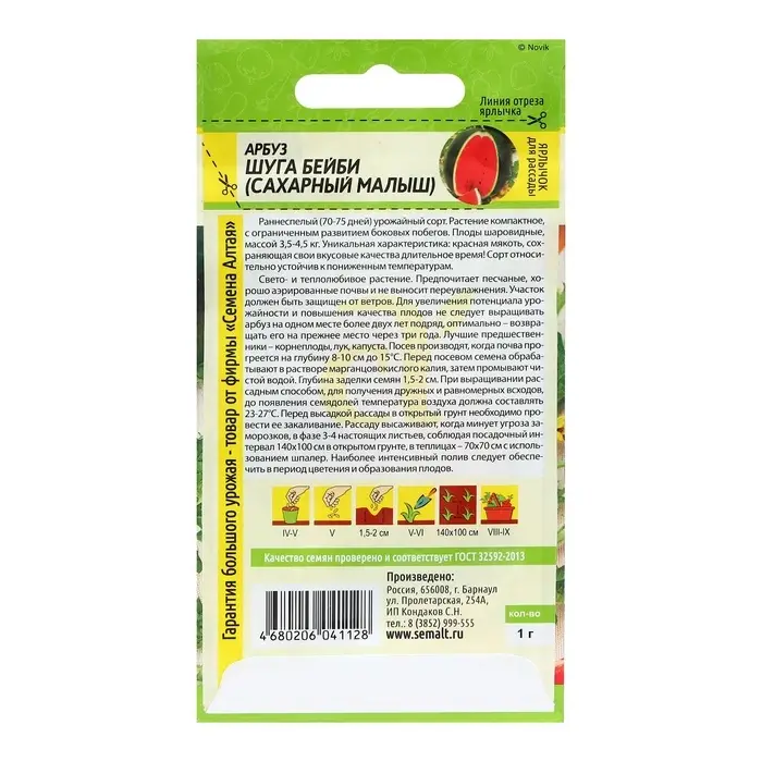 Раннеспелый сорт (70-75 дней). Уникальная характеристика: красная мякоть, сохраняющая свои вкусовые качества длительное время! Урожайный сорт, относительно устойчивый к пониженным температурам. Плоды шаровидные, массой 3,5-4,5 кг. Растение компактное, с ограниченным развитием боковых побегов. Свето- и теплолюбивое растение. Предпочитает песчаные, хорошо аэрированные почвы и не выносит переувлажнения. Участок должен быть защищён от ветров. Для увеличения потенциала урожайности и повышения качества плодов, не следует выращивать арбуз на одном месте более двух лет подряд, оптимально – возвращать его на прежнее место через три года. Лучшие предшественники — корнеплоды, лук, капуста. Посев производят, когда почва прогреется до 15°С на глубину 8-10 см. Перед посевом семена обрабатывают в растворе марганцовокислого калия, затем промывают чистой водой. Глубина заделки семян 1,5-2 см. При выращивании рассадным способом, для получения дружных и равномерных всходов, до появления семядолей температура воздуха должна составлять 23–27°C. Перед высадкой рассады в открытый грунт, необходимо провести ее закаливание. Рассаду высаживают, когда минует угроза заморозков, в фазе 3-4 настоящих листьев, соблюдая посадочный интервал 140х100 см в открытом грунте, в теплицах —70х70 см с использованием шпалер. Наиболее интенсивный полив следует обеспечить в период цветения и образования плодов.