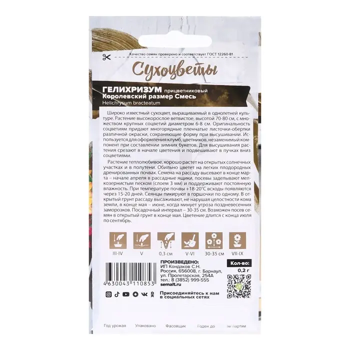 Семена цветов Гелихризум "Русский размер", 0,1 г