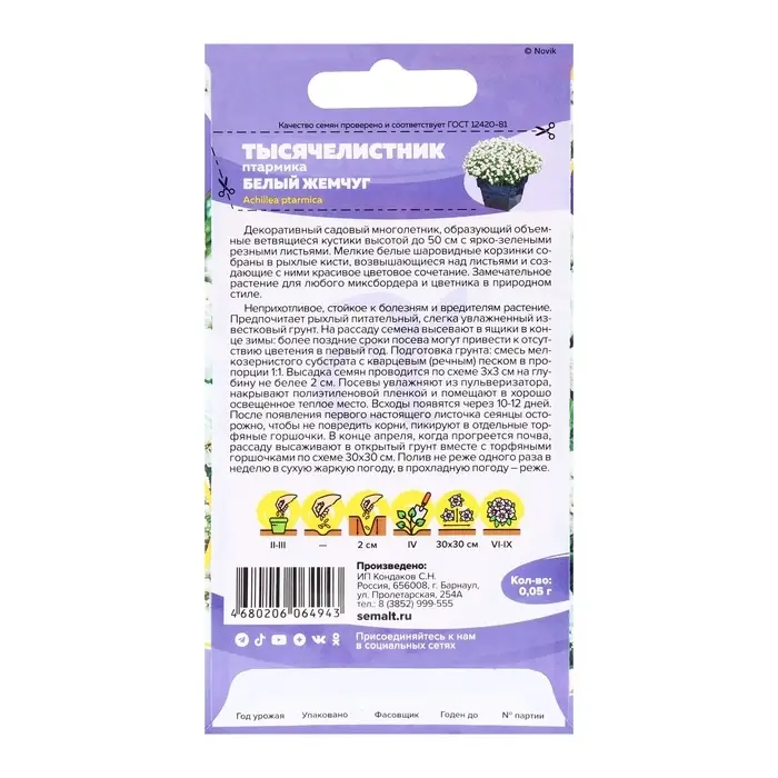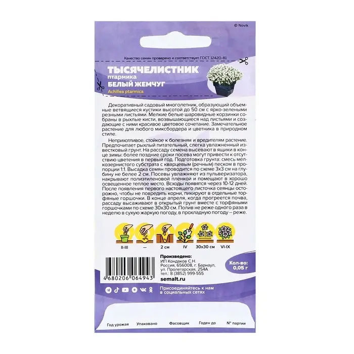 Семена Тысячелистник "Белый жемчуг", ц/п, 0,05 гр.