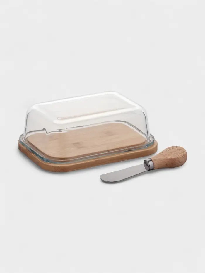 Масленка с бамбуковой крышкой-подставкой и ножом, 17,4х13х6,5 см