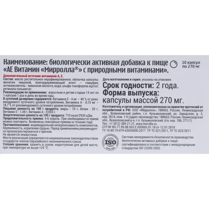 Пищевая добавка Mirrolla «АЕ ВИТамин» с природными витаминами, 10 капсул