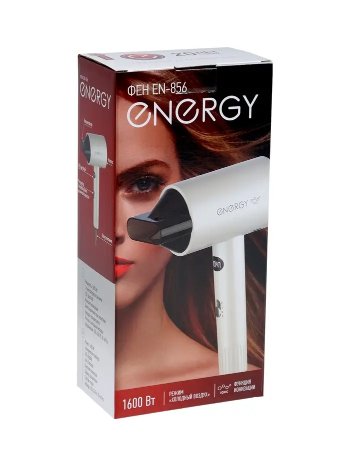 Фен Energy EN-856, 1600 Вт, 2 скорости, 3 температурных режима, ионизация, дисплей, белый